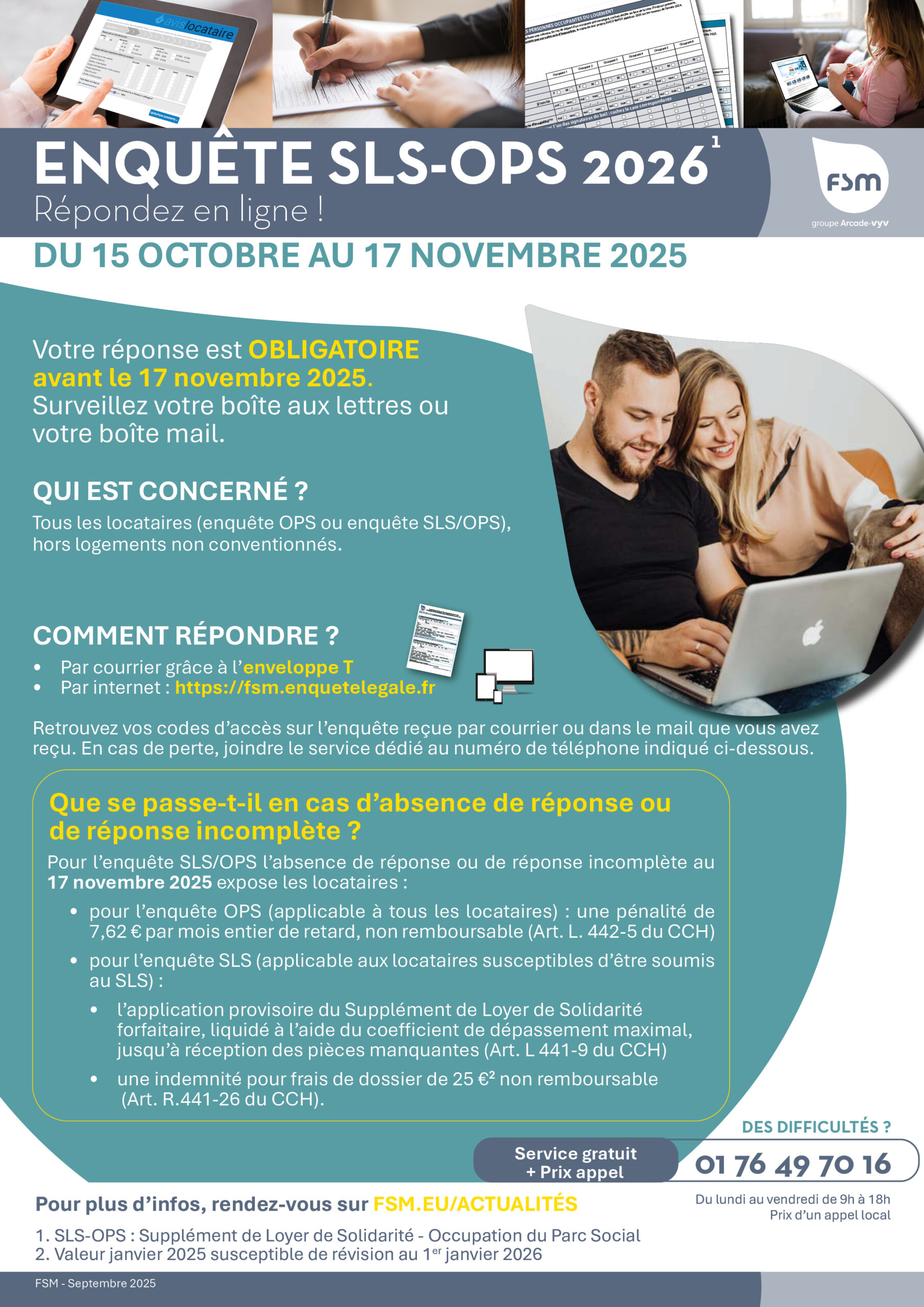 À partir du 15 octobre 2025, les locataires reçoivent par courrier un questionnaire prérempli ou des codes d’accès au site : https://fsm.enquetelegale.fr pour traitement dématérialisé. Votre réponse est OBLIGATOIRE et vous avez jusqu’au 17 novembre 2025 pour y répondre.